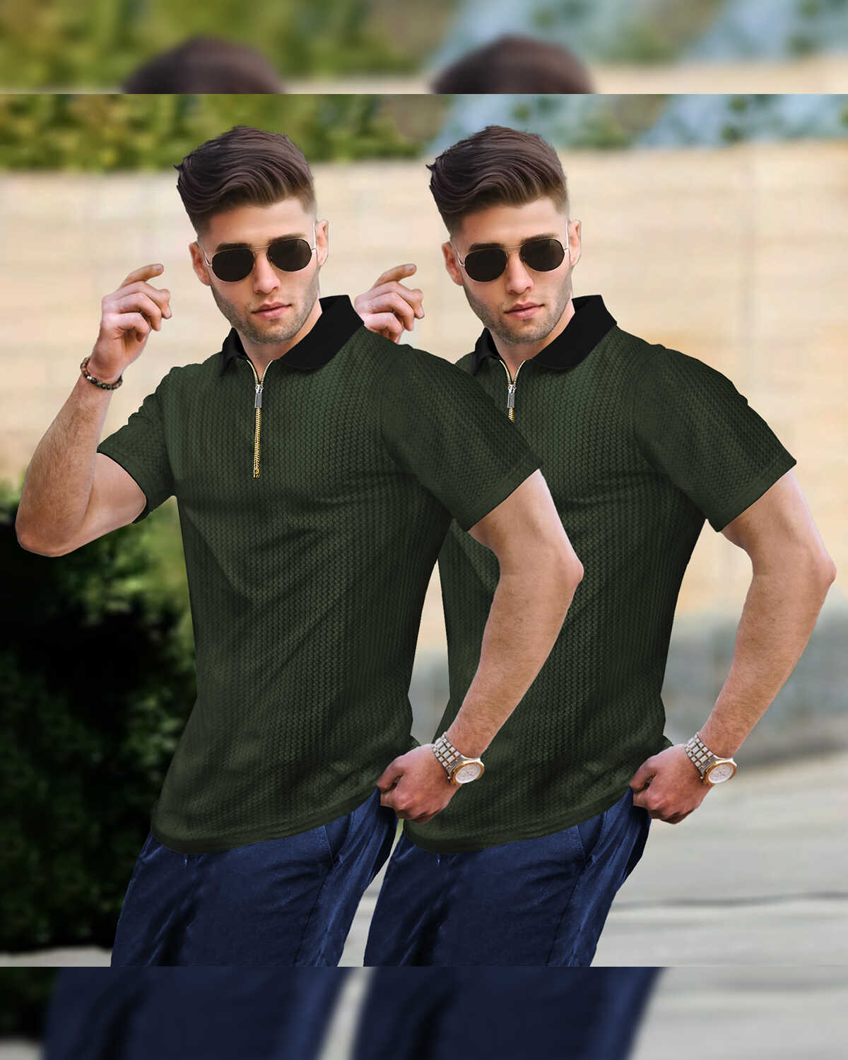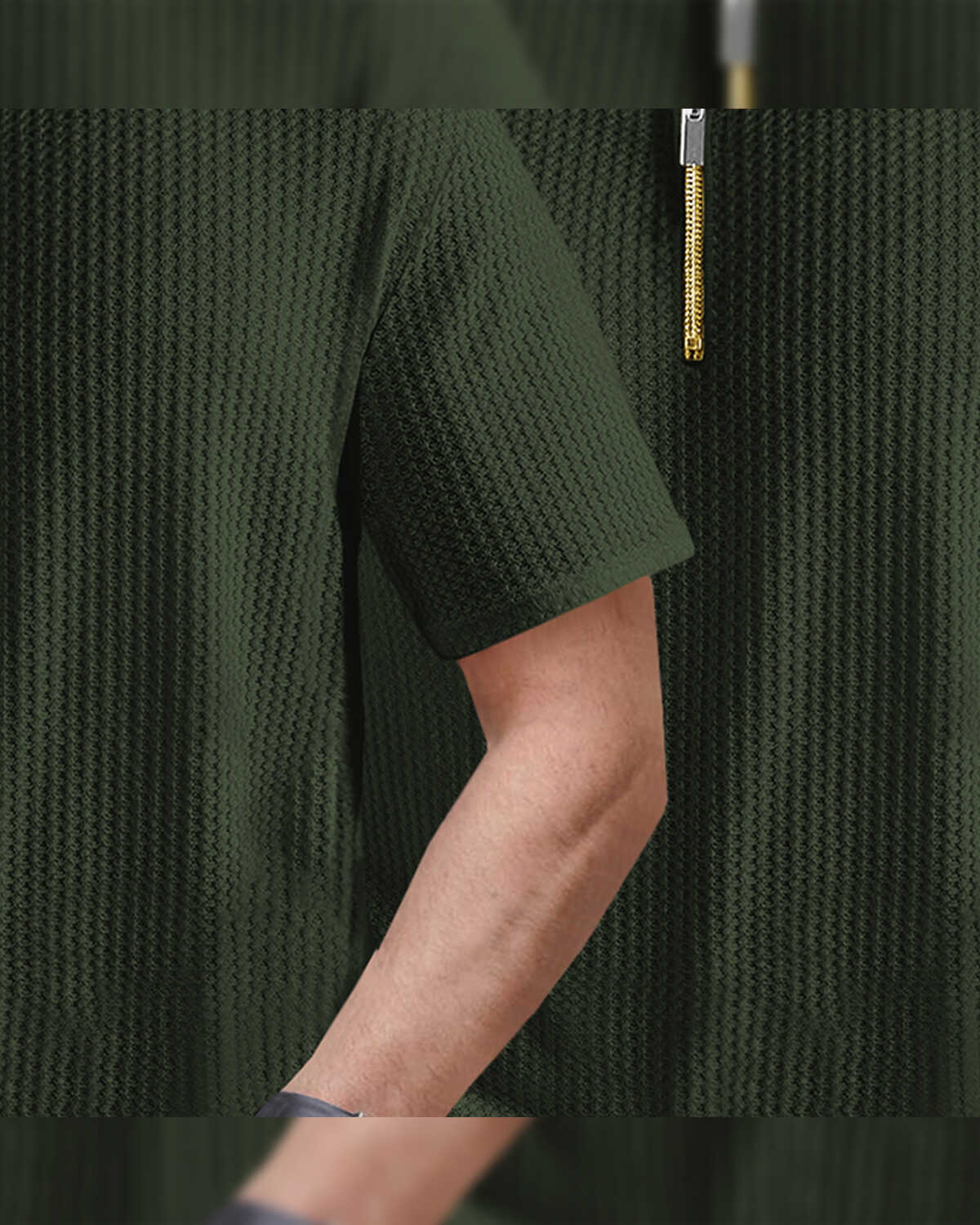 (Pack Of 2) Polo Collar Contrast Waffle Olive Green Textured T-shirts