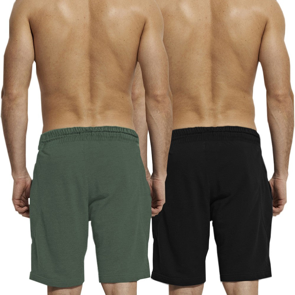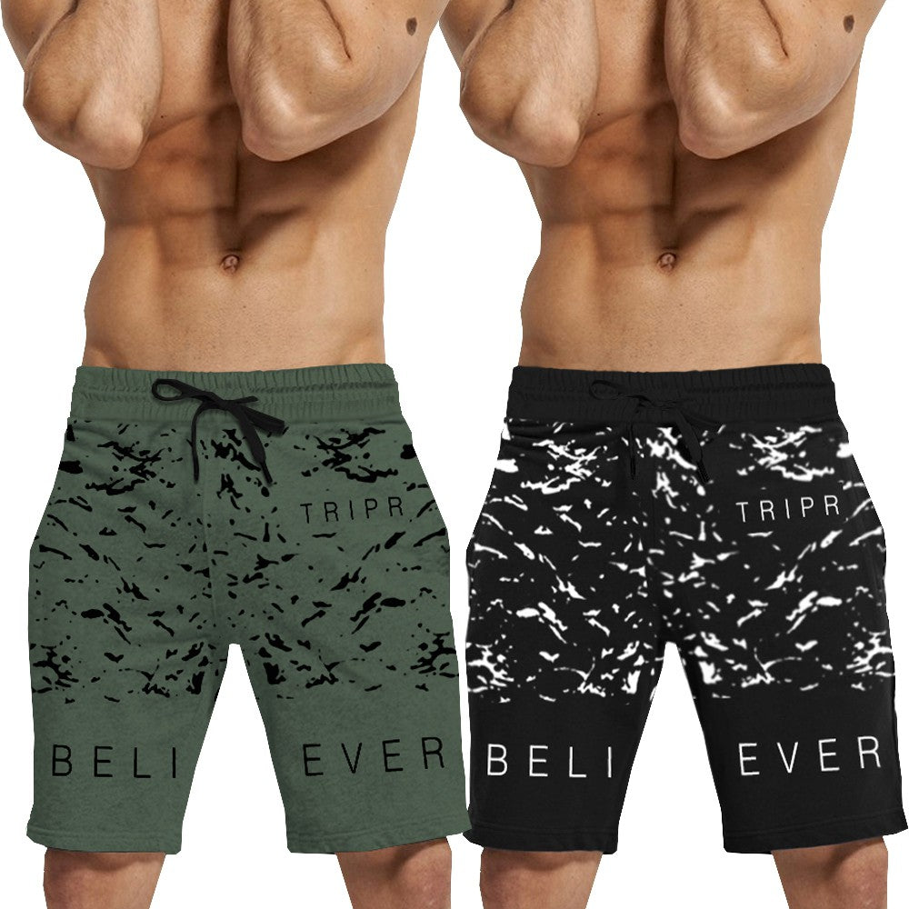 Buy combo pack of 2 best quality "Believer" men's shorts in Black and Green colour from Tripr India. Pair these shorts with a round neck or a sleeveless tank for a complete stylish looks. Designed in solid colour with digital prints, these shorts are very comfortable and gives great fitting. Shop now.