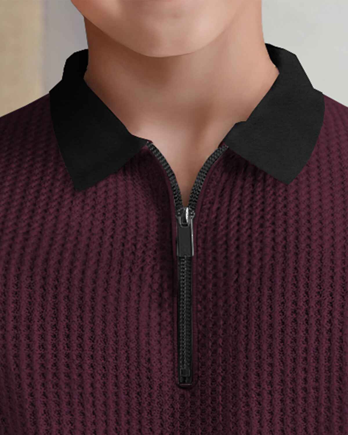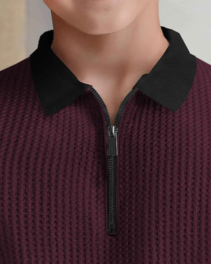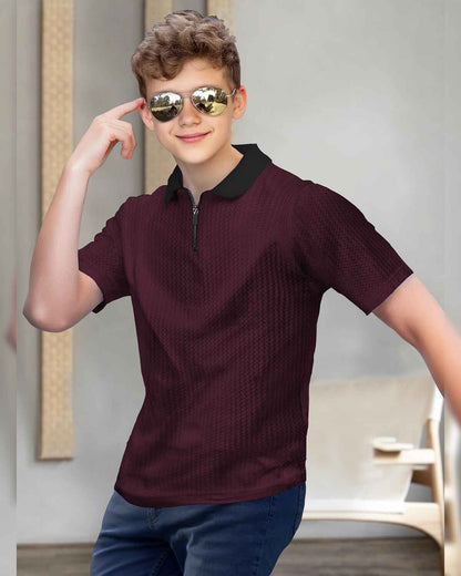 Boy Half Sleeve Maroon & Black Plain Textured T-shirt