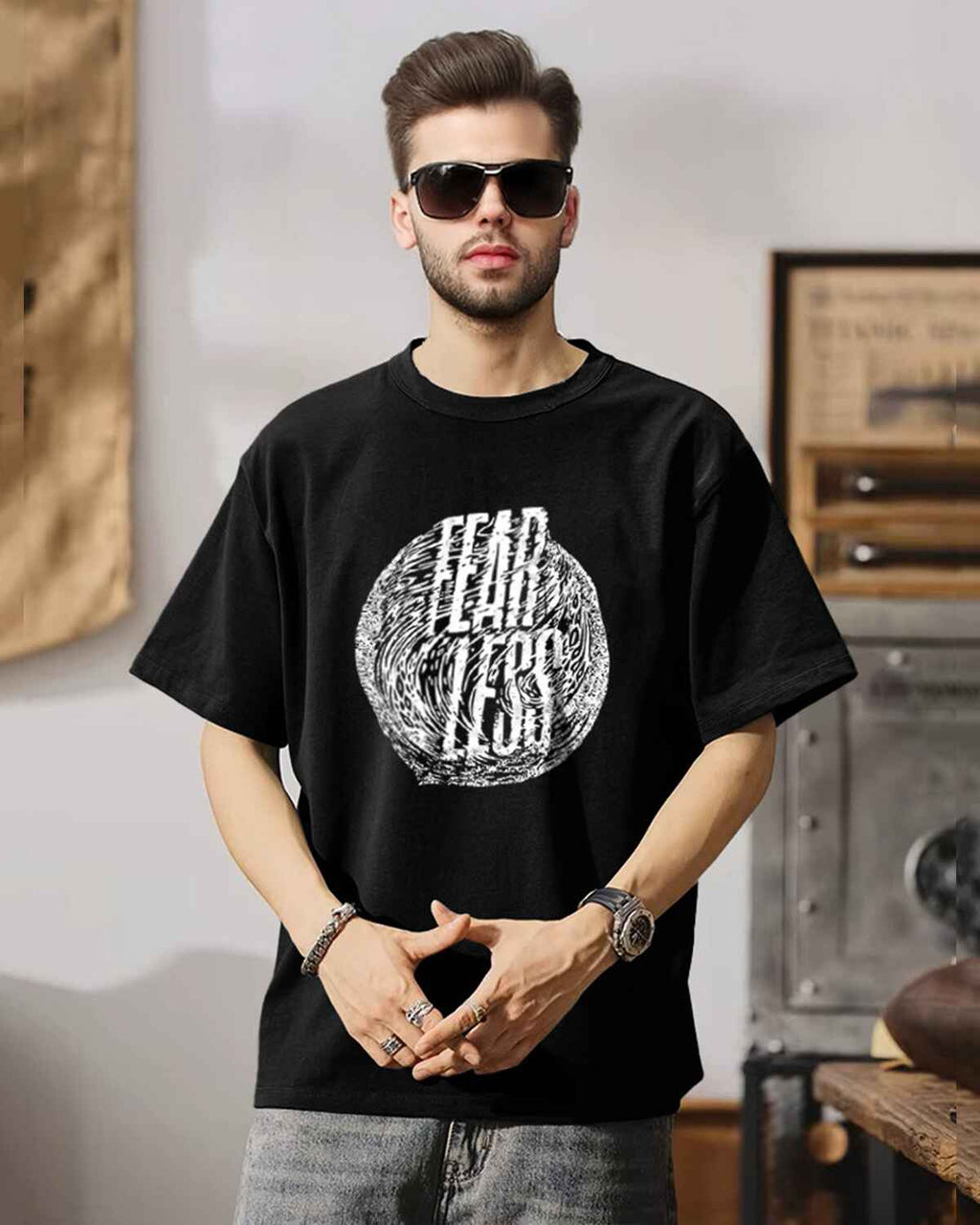 Trendy oversized t-shirts with bold all-over printed designs.