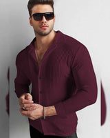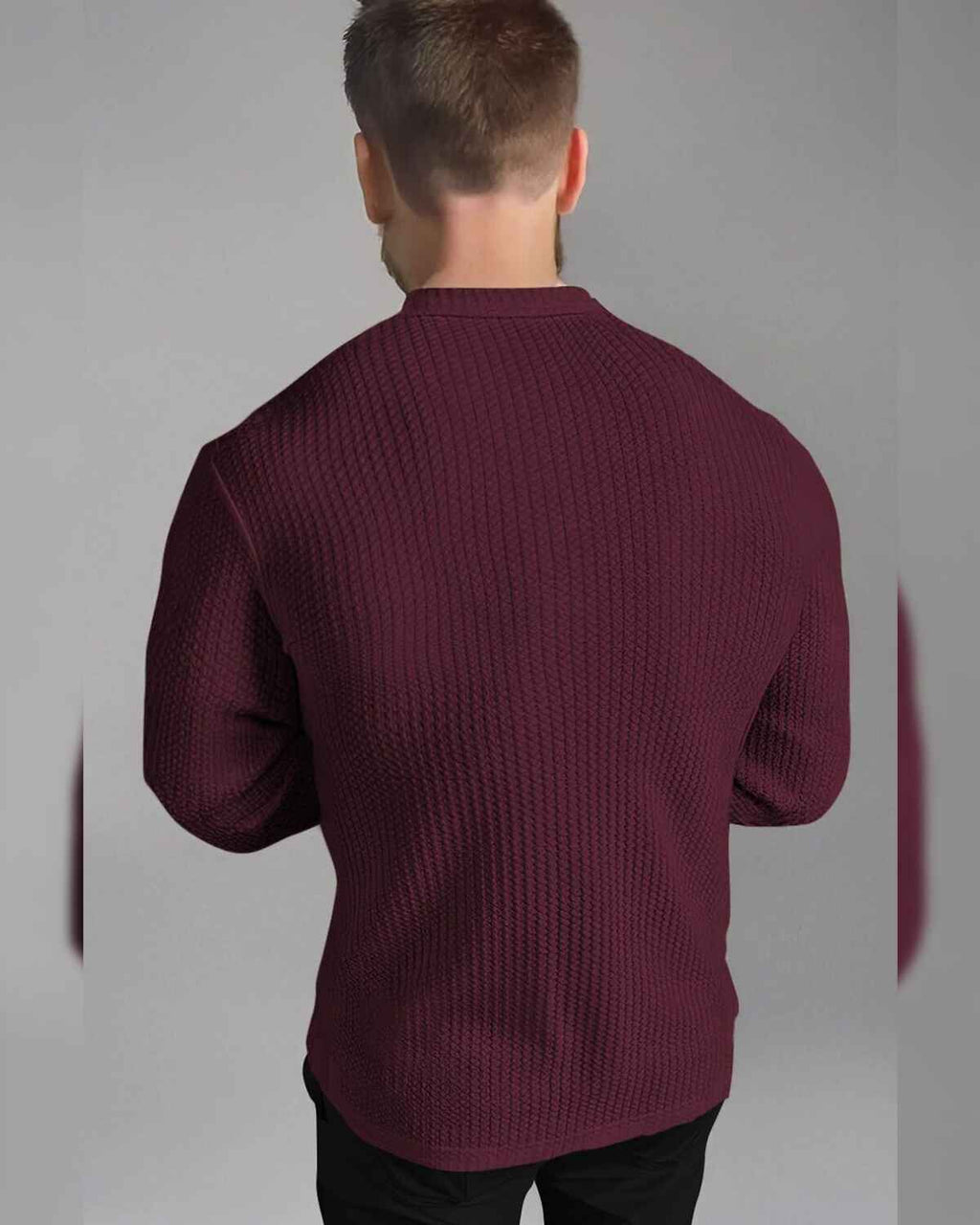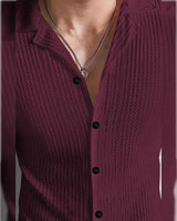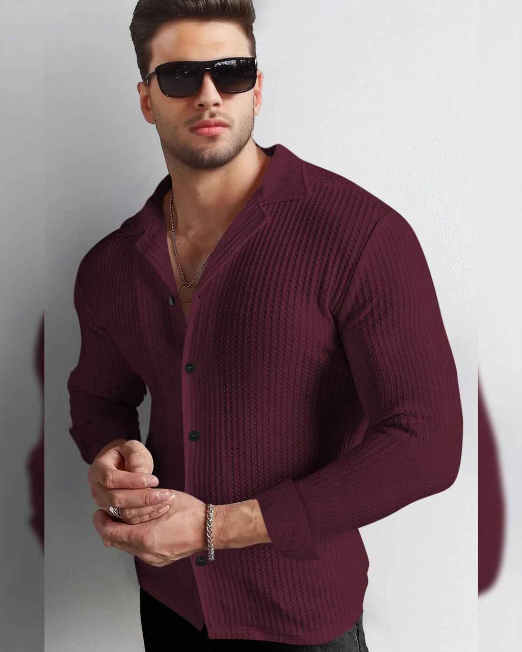 Men Full Sleeve Maroon Solid Color Waffle Textured Shirt