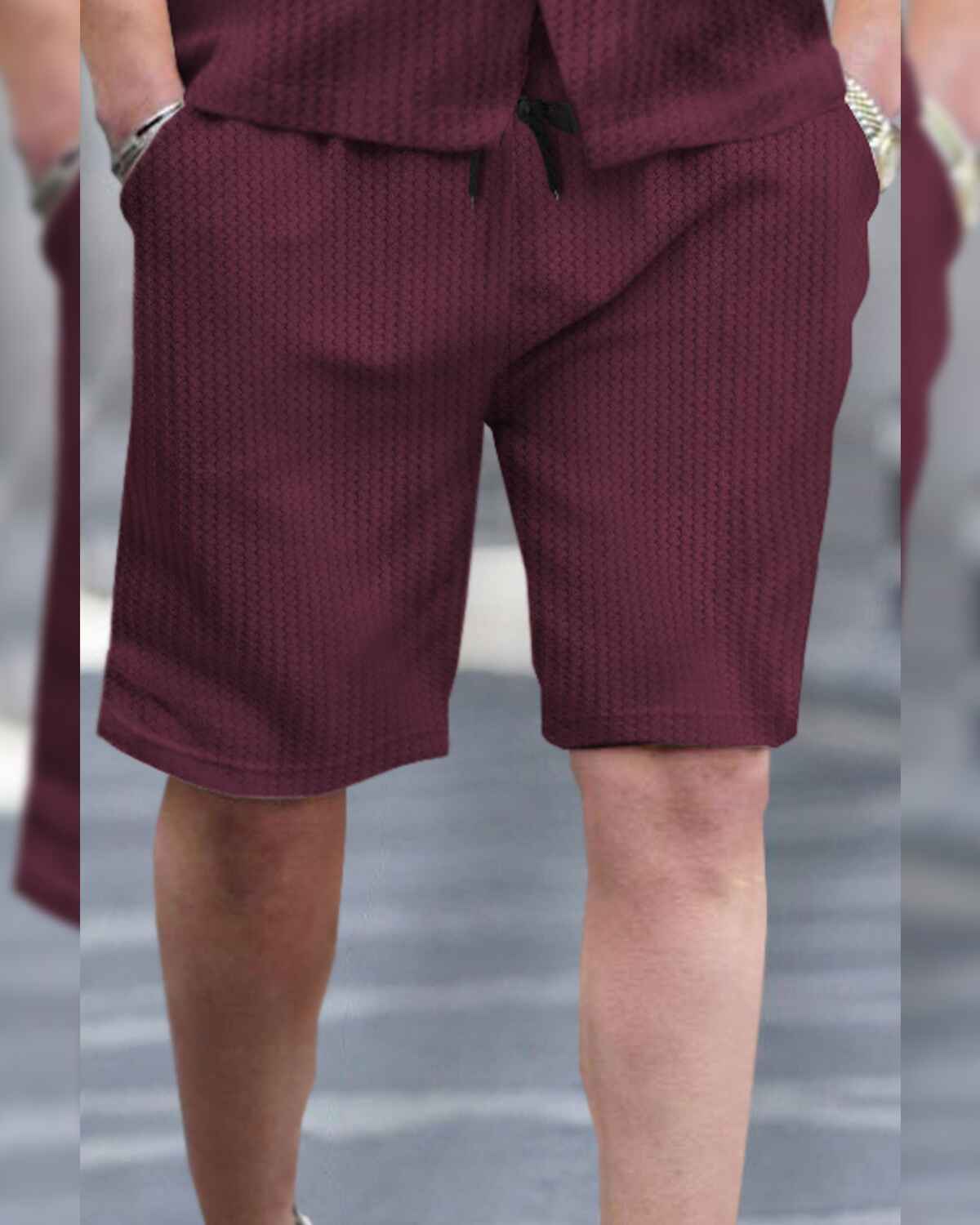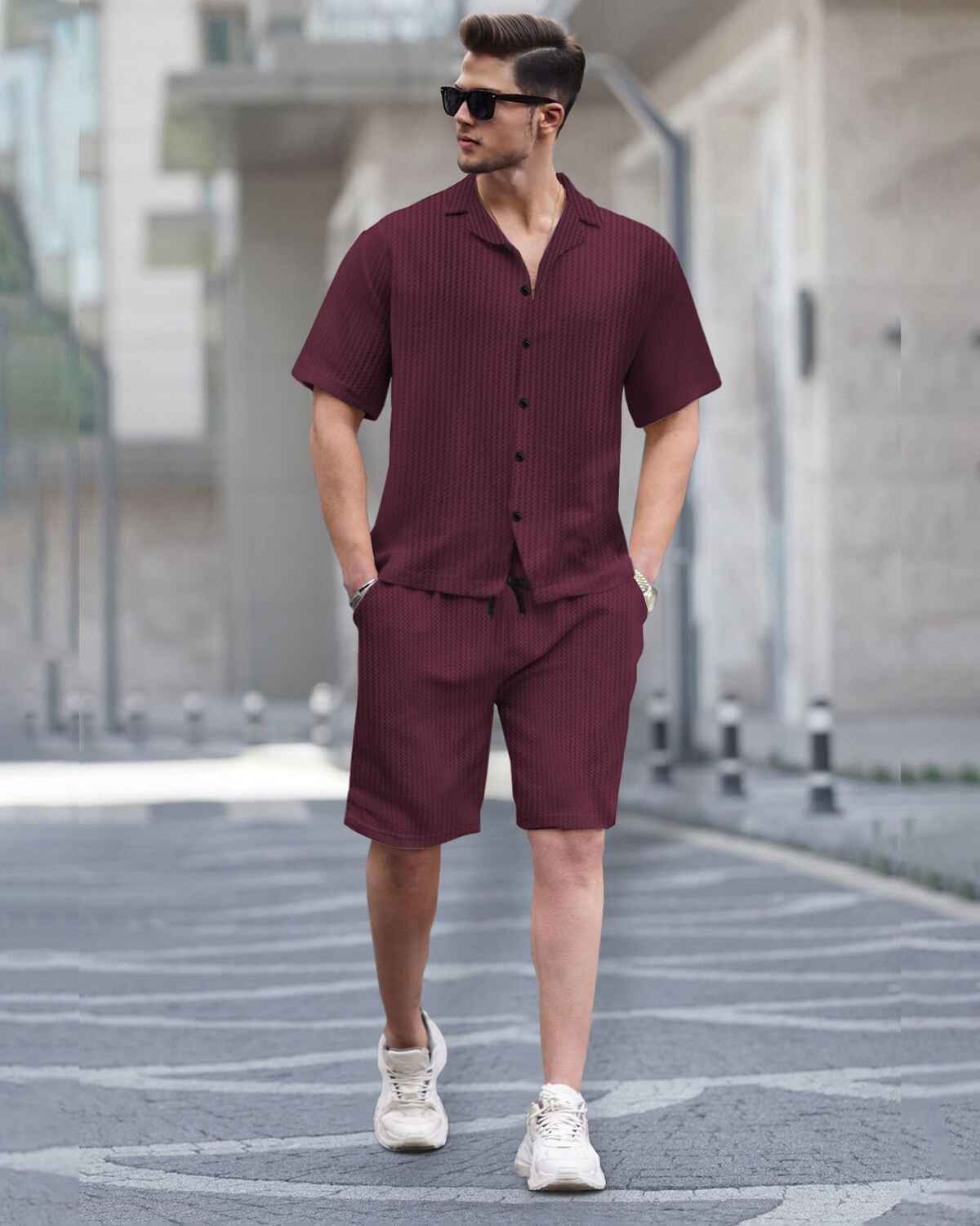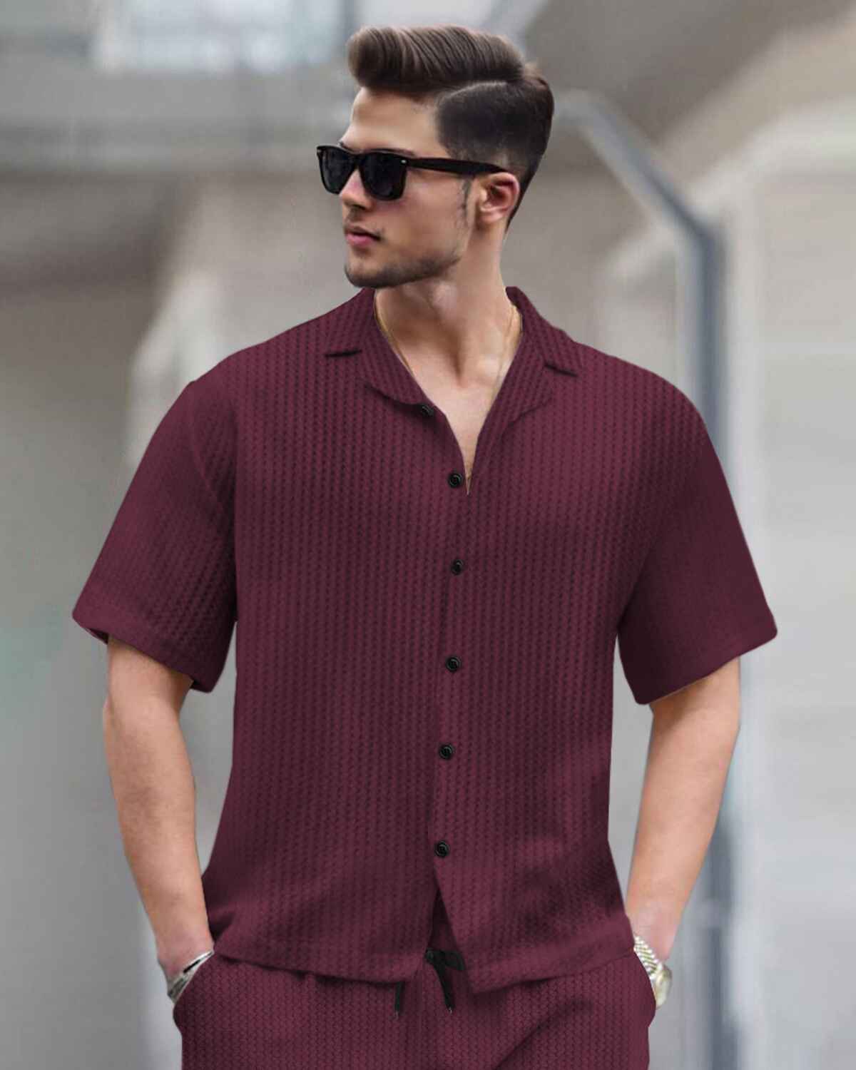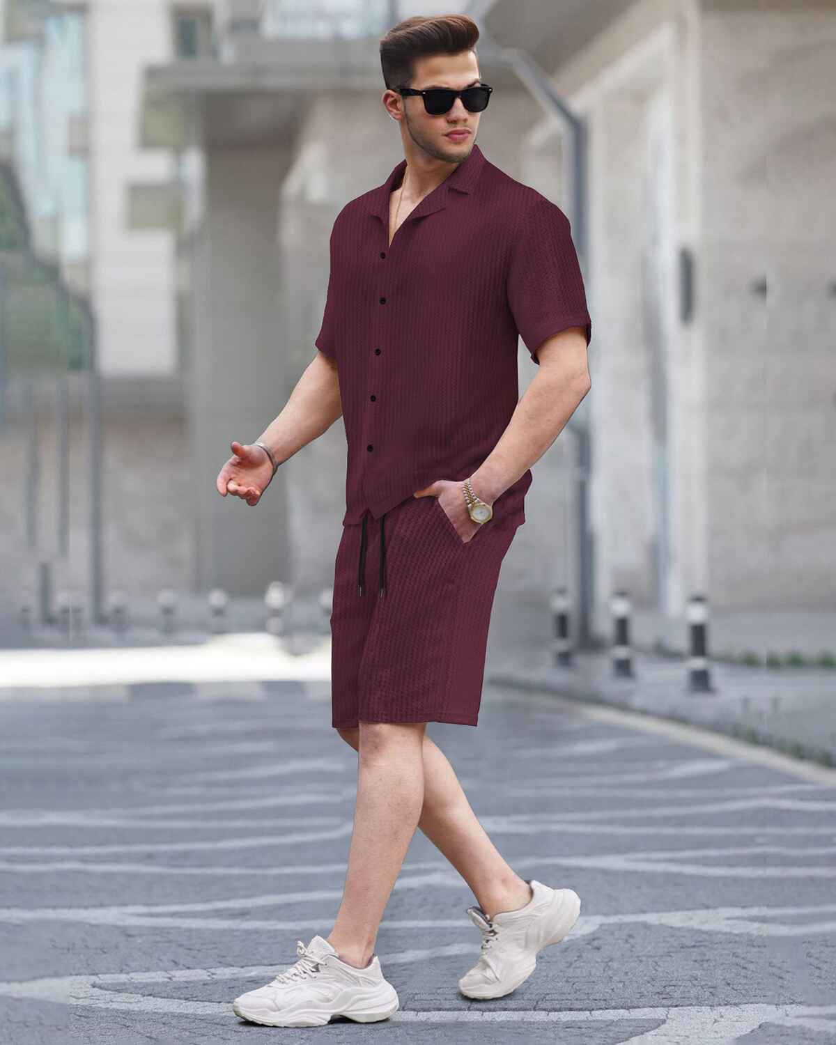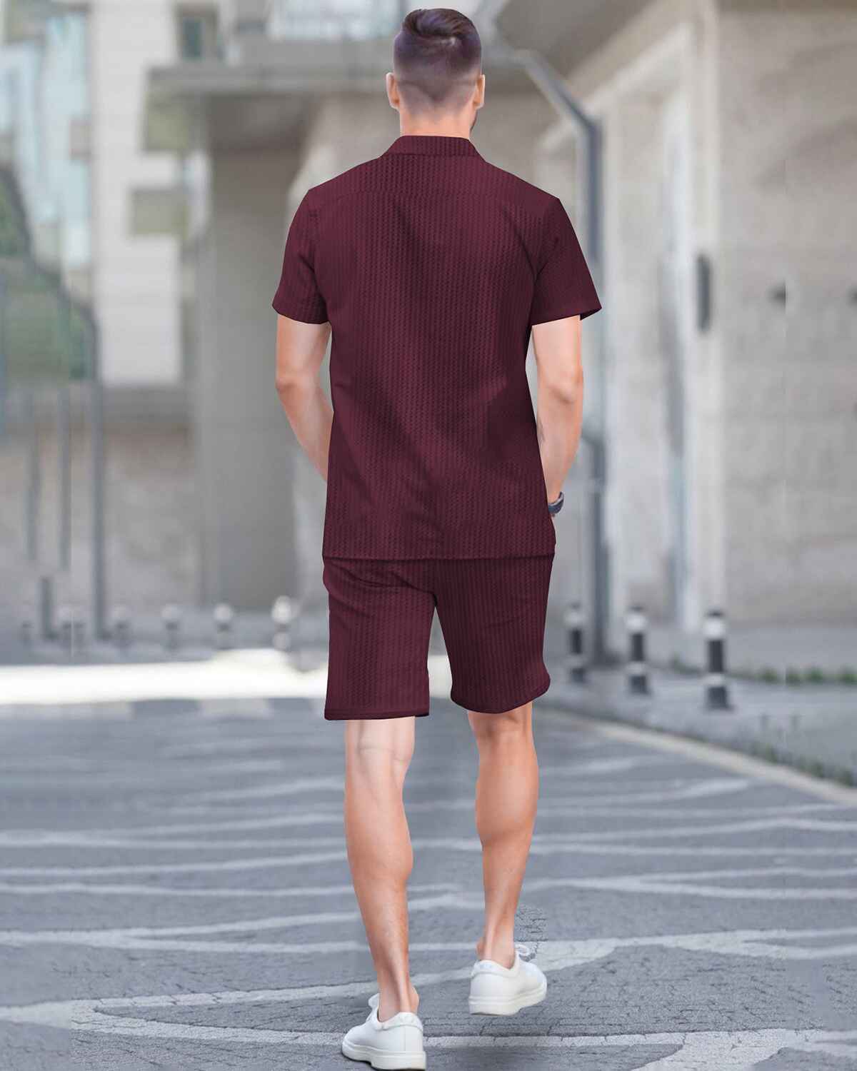WAFFLE PLAIN TEXTURED MAROON SHIRT WITH SHORT TRACKSUIT