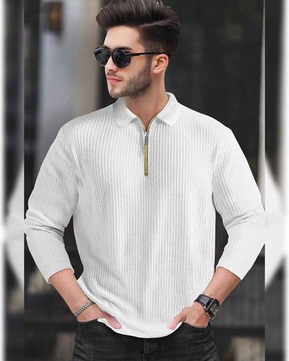 Men’s Waffle Textured White Full Sleeve Polo T-Shirt with Quarter Zip Neck