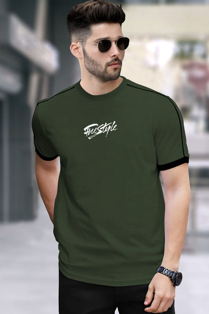 - Olive Green & Black Round Neck T shirt, provides a stylish contrast.