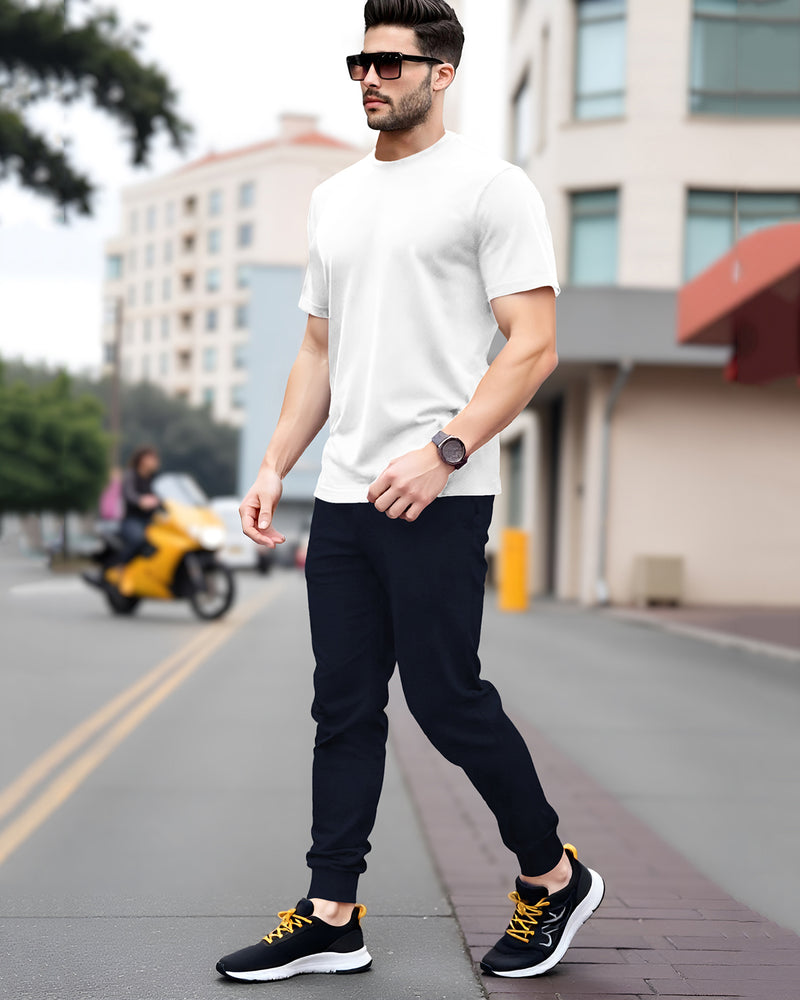 🔹 Stylish & Minimalist Design – A plain half-sleeve T-shirt paired with plain track pants for a sleek, modern look.