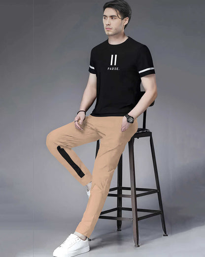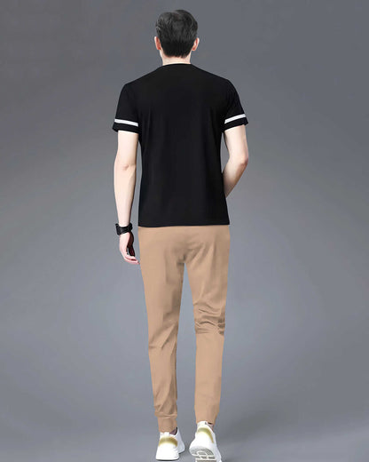 Half Sleeve Black Printed T-shirt with Beige Colorblocked Trackpant Tracksuit